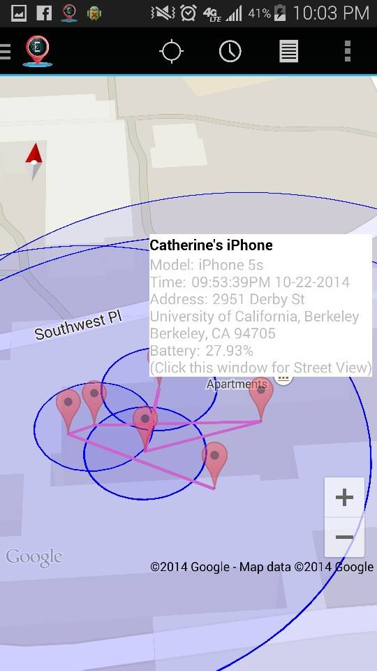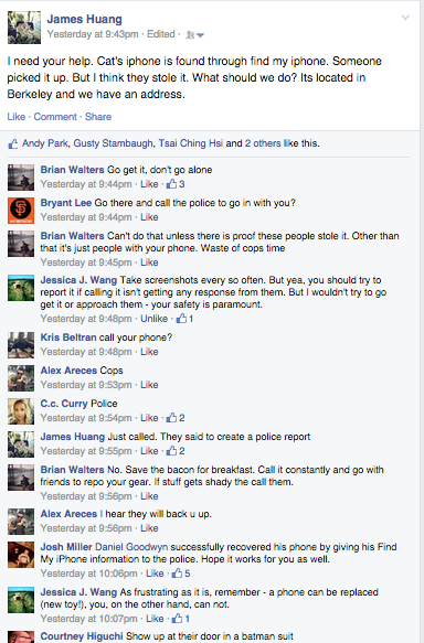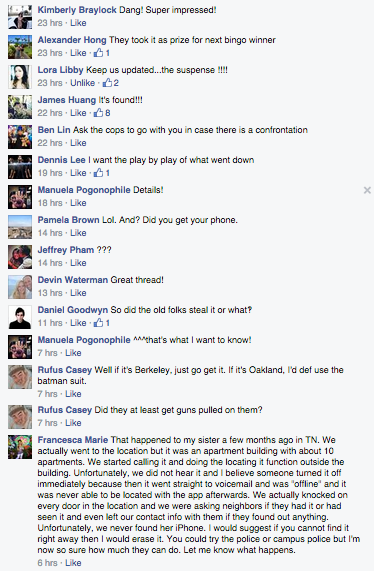 We soon decide to call the police.  The first response, “Did you file the phone as lost or stolen?” Thats why we called the police.  It wasn’t an emergency so we had to go online and fill out a report.  I did it as fast I could.  Once we submitted the report it says that it won’t be processed for another 5 business days.  That’s when, we both decide we need to take action, so we hop in our car and started heading towards the destination of the phone.  On the way we call the Berkeley police one more time, this time we had a police report number, so they were able to assist us.  We told them our plan to get the phone through Find my iphone and they were on board.  Three police officers rendezvoused with us at the address of the phone.  To our surprise we found the location to be a senior citizen residence.  We were slightly relieved.  All these thoughts started going through our minds.  (Hopefully, its just a senile elder that took the phone by mistake.  Worst case senario it could be a juvenile child that stole the phone and is hiding out here.)  Long story short we got the phone back.*